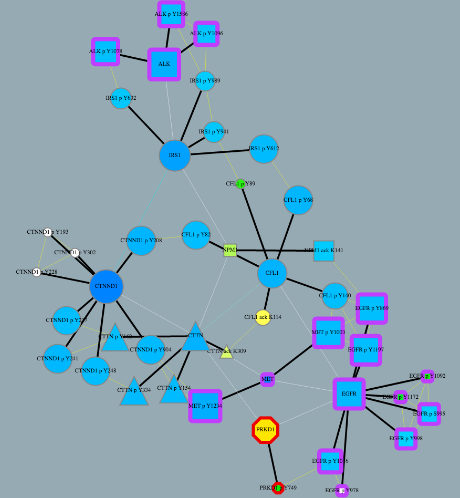 The TieDIE algorithm computes a subnetwork of gene and protein interactions that connect genomic perturbations to gene expression changes characteristic of cancer subtypes. The pathways derived using the TieDIE app(algorithm) predict interlinking genes(linker nodes, yellow ones in animation) that may correspond to essential components of cancer signaling and may provide a mechanistic explanation of tumor behavior and suggest subtype-specific drug targets.